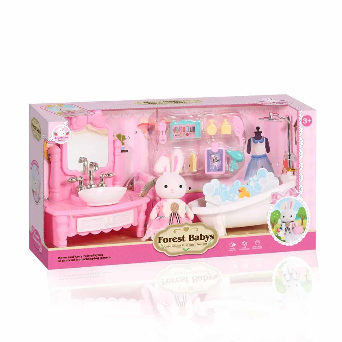 O kit traz dois ambientes completos que enriquecem a brincadeira e permitem criar inúmeras histórias: um quarto cheio de estilo e um banheiro encantador, ambos acompanhados de acessórios e coelhinhos adoráveis.