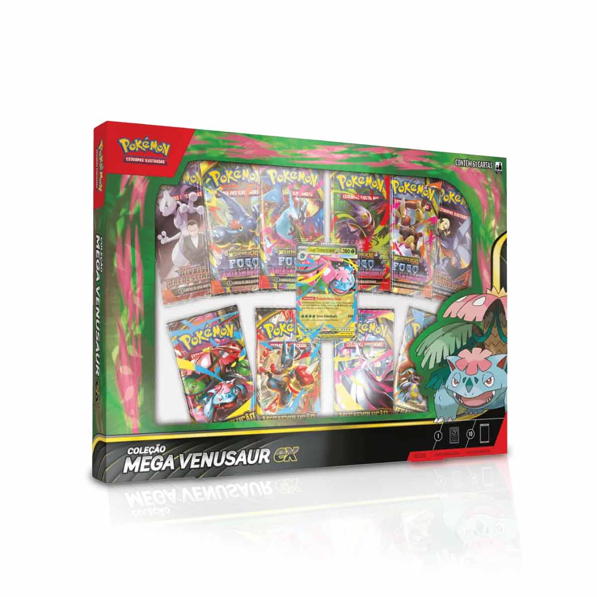Esta box oficial Copag vem lacrada e em Português Brasil, garantindo autenticidade e qualidade. O grande destaque é a carta promocional Mega Venusaur ex, perfeita para fortalecer decks e valorizar qualquer coleção, além dos boosters oficiais que trazem a emoção de abrir novas cartas e descobrir raridades.